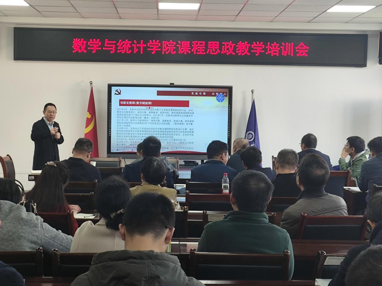 鲜思东教授以“党建引领,启智润心”为主题,结合自身教学经验展开分享:一是依托案例梳理课程育人历程,呈现“专业+思政”协同路径;二是用数据与奖项具象化育人成效;三是分享以党支部为载体的党建引领措施;四是针对统计学提出“课堂渗透+实践强化+科研融合”育人路径。