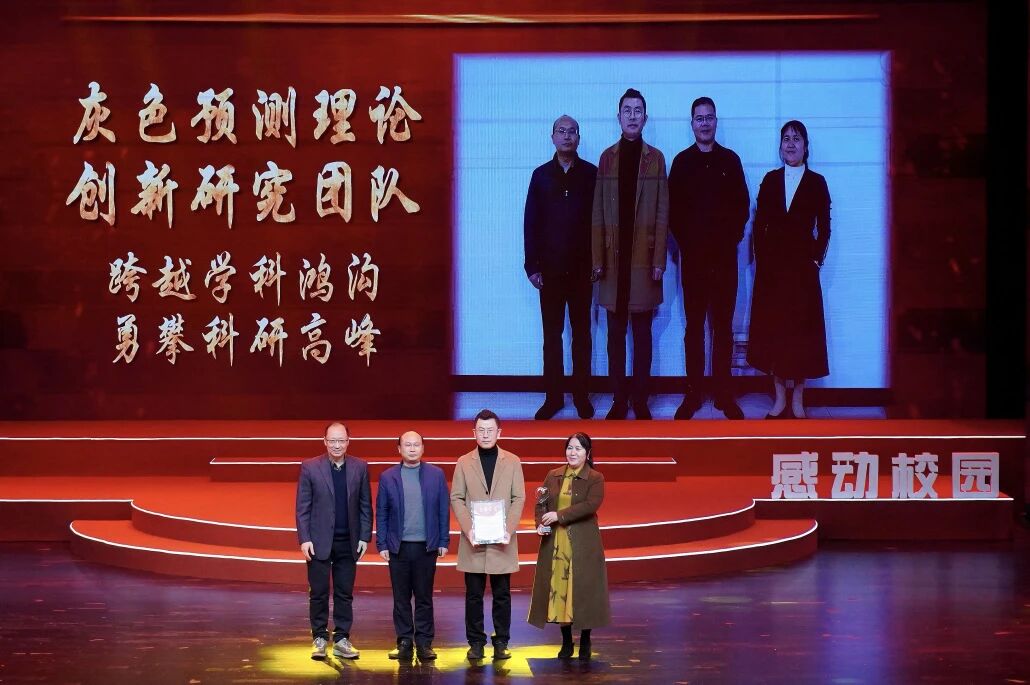 12月19日,重庆工商大学第十四届“感动校园人物”颁奖典礼在学校剧场隆重举行,我院灰色预测理论创新研究团队凭借其跨学科科研攻坚的卓越贡献,荣获本届“感动校园人物”称号。党委常委、副校长张波为团队颁奖,全校师生共同见证了这一荣誉时刻。