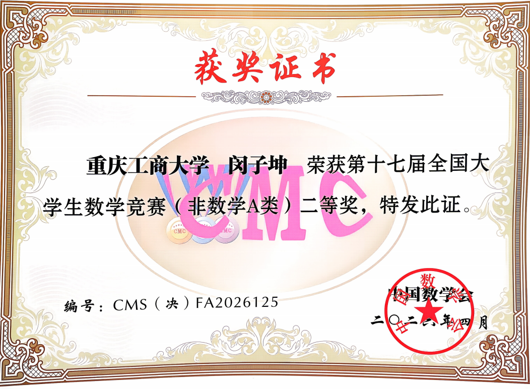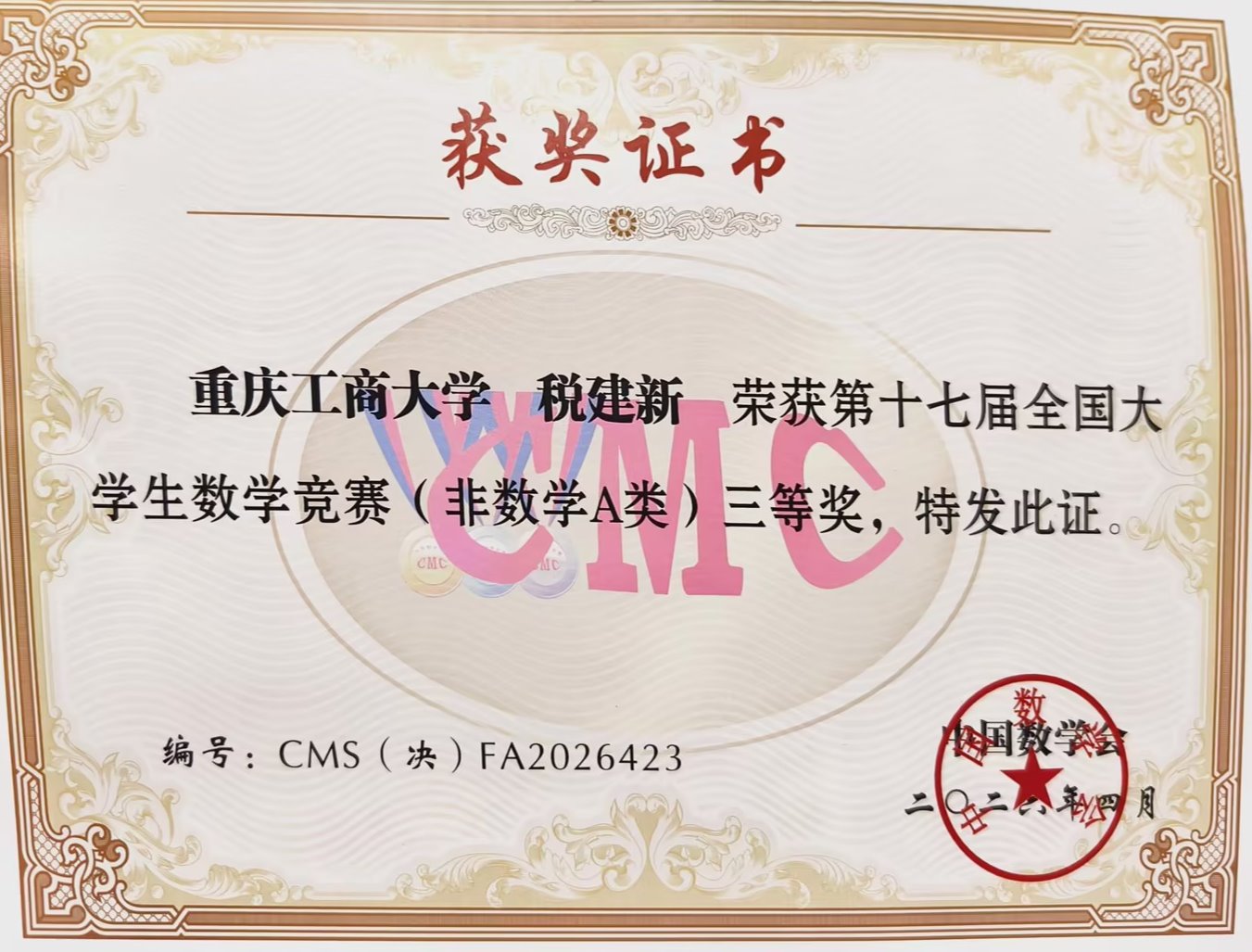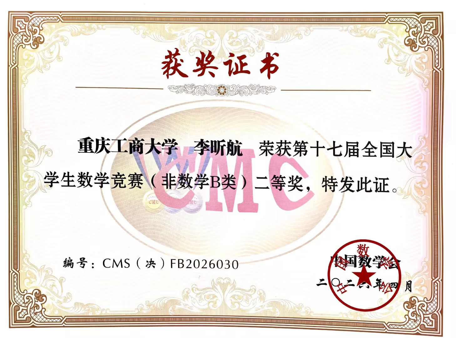近日,第十七届全国大学生数学竞赛决赛成绩揭晓,我校学子再创辉煌,闵子坤同学荣获非数学A类二等奖、李昕航同学获得非数学B类二等奖、税建新同学获得非数学A类三等奖,展现了我校学子扎实的数学功底和卓越的创新能力。