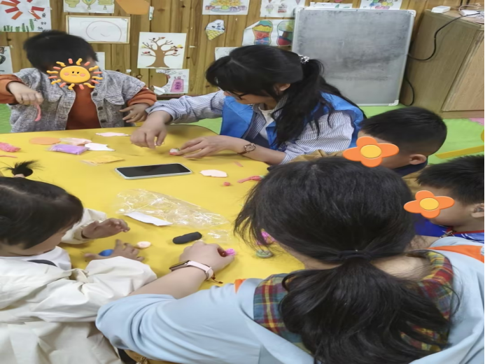 活动前期,志愿者们与向阳花特殊儿童康复中心负责人完成对接,明确活动时间、场地及儿童基本信息,开展志愿者招募与培训工作,筹备贴纸画、超轻黏土等活动物资,保障活动规范有序进行。活动现场,志愿者们以一对一形式陪伴7—8岁特殊儿童,依次开展贴纸画创作、超轻黏土手工活动。志愿者们语气温和、动作轻柔,严格遵循陪伴规范与隐私保护要求,不设定完成目标、不催促进度,充分尊重儿童参与节奏,引导儿童自由创作、感受乐趣,现场氛围温馨有序。活动尾声,志愿者们共同清理活动场地,整理并回收活动物资,与儿童及机构工作人员有序告别。