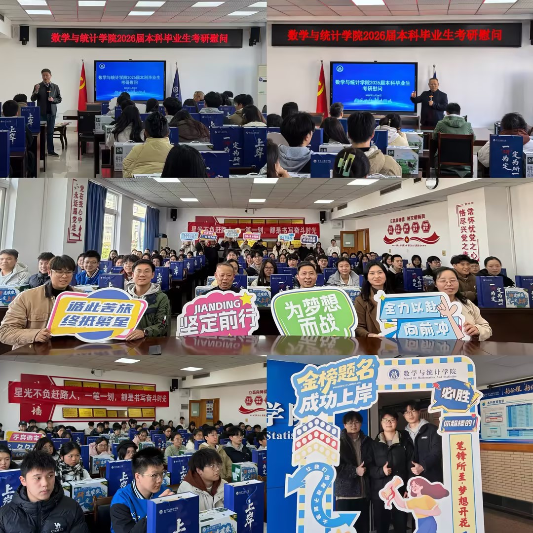 为鼓舞2026届考研学子士气,坚定备考信心,营造温馨奋进的迎考氛围,11月28日下午,数学与统计学院隆重举行“‘数’海扬帆,‘研’途相伴”考研慰问活动。学院党委书记张朝毅,院长陈义安,党委副书记、纪委书记杨婷,副院长杨炜明,全体2026届毕业班辅导员及备战考研的学子们共同参与了本次活动。
