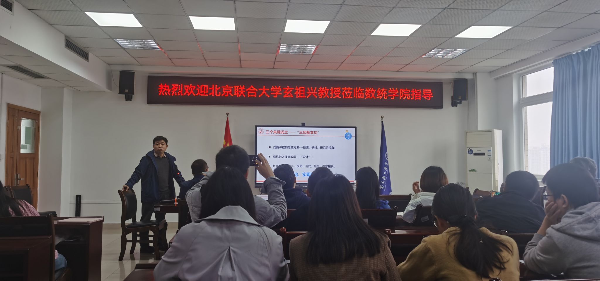 2023年11月23日上午,北京联合大学玄祖兴教授应邀来重庆工商大学数学与统计学院作了题为《贝叶斯公式中的课程思政教学设计》的高水平课程思政教学设计报告。学术报告由数学与统计学院副院长龙宪军教授主持,学院骨干教师和学院的新进教师参加了报告会。