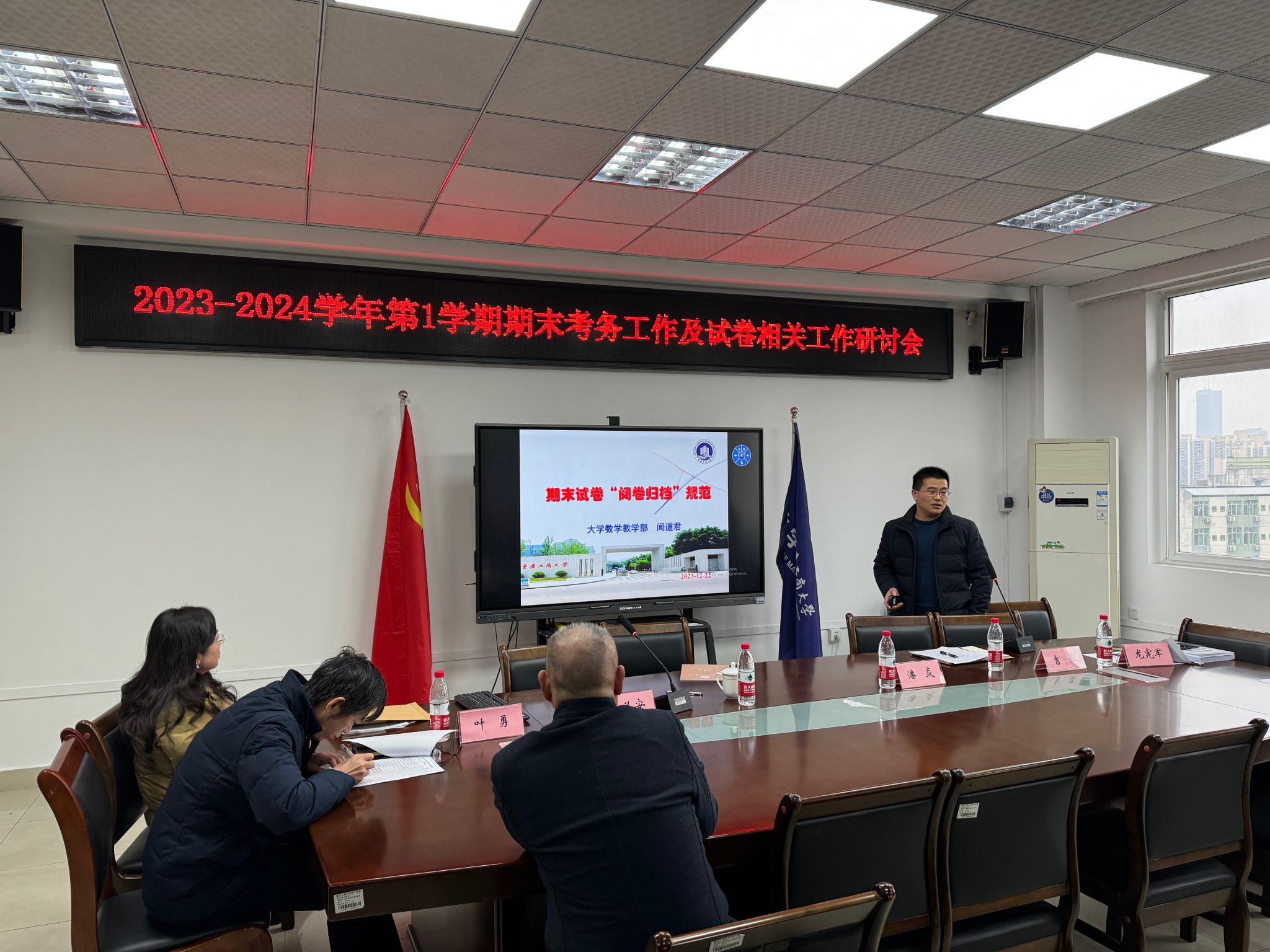 第二阶段,大学数学教学部主任闻道君做关于“试卷出题批阅归档”专题讲座。闻道君根据《关于 2022-2023 学年第二学期本科课程考试试卷和毕业论文(设计)抽查情况的通报》中关于试卷的12个观测点分析了学院抽查试卷存在的问题,并结合具体示例,详细讲解了期末试卷、批阅、试卷分析、归档等环节的注意事项。